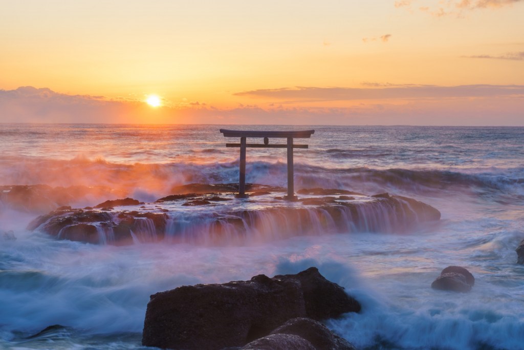 平安時代に海岸に神が降り立ったという伝承に基づき創建されたと伝わります。医薬、健康、縁結び、航海安全、大漁満足にご利益があるとされます。特に、海上の岩礁に立つ鳥居(神磯の鳥居)は、荒波の中に立つ姿や日の出の美しさで知られ、多くの人が訪れます。